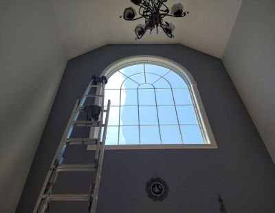 Tall interior windows are cleaned using specialized ladders with padded or covered ends to protect walls. Each window is carefully washed and dried from top.