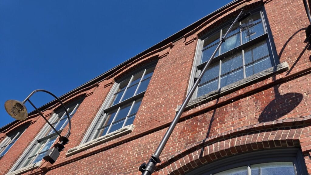 Exterior commercial window cleaning using a state-of-the-art water-fed purification system that delivers spotless, streak-free results. The system filters water to remove minerals and impurities, ensuring a crystal-clear finish without the need for harsh chemicals. Telescopic poles allow safe and efficient cleaning of windows up to three stories high, eliminating the need for ladders or scaffolding. Ideal for offices, retail spaces, and low-rise buildings seeking a professional, eco-friendly solution that enhances visibility and curb appeal.